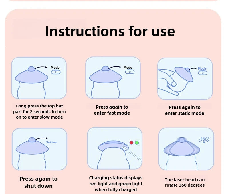 1. Press and hold the top part for 1 second to turn it on, enter the slow mode, and press the top again to enter the fast mode.